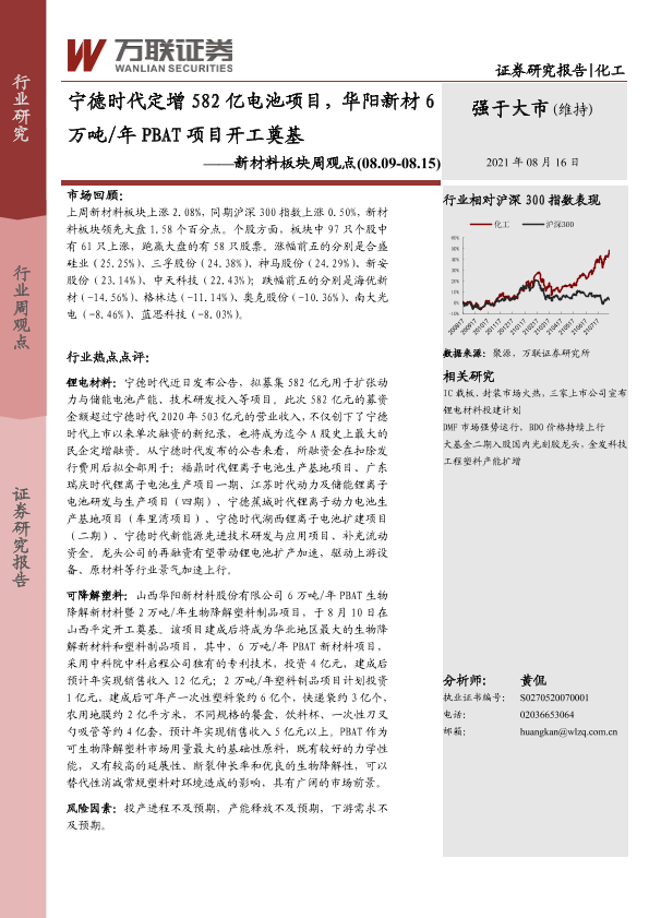 【万联证券】【20210816】20210816-万联证券-化工新材料板块周观点:宁德时代定增582亿电池项目,华阳新材6万吨/年PBAT项目开工奠基-11页