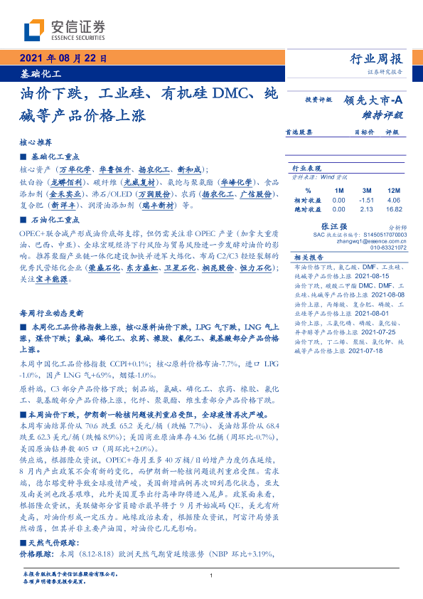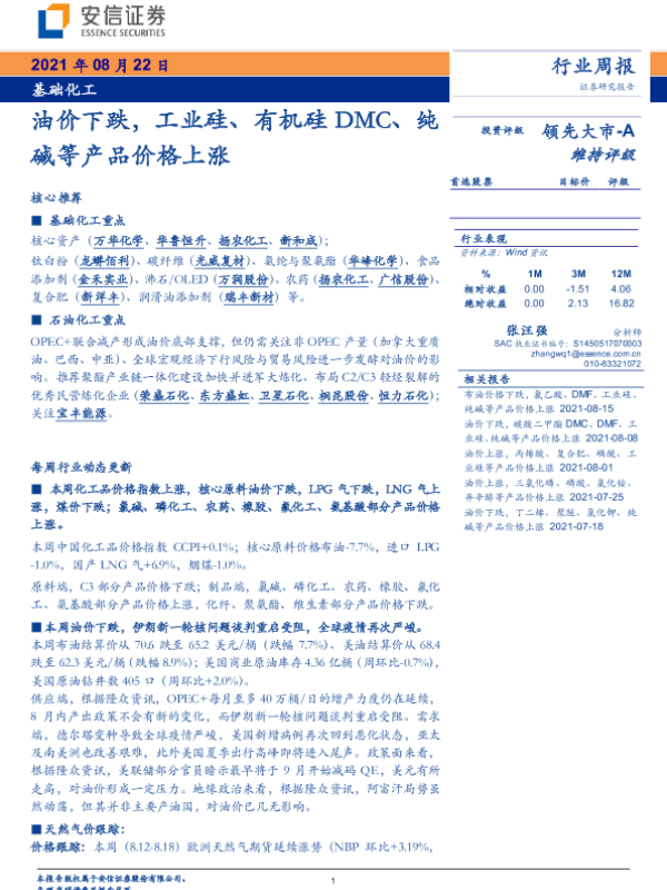 【安信证券】【20210822】基础化工行业周报:油价下跌,工业硅、有机硅DMC、纯碱等产品价格上涨-5页