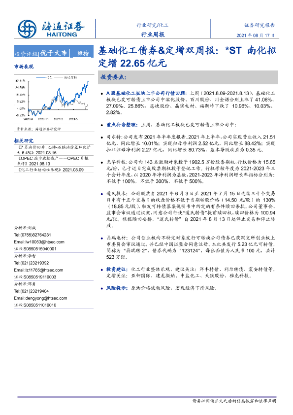 【海通证券】【20210817】20210817-海通证券-基础化工债券&定增双周报:ST南化拟定增22.65亿元-15页