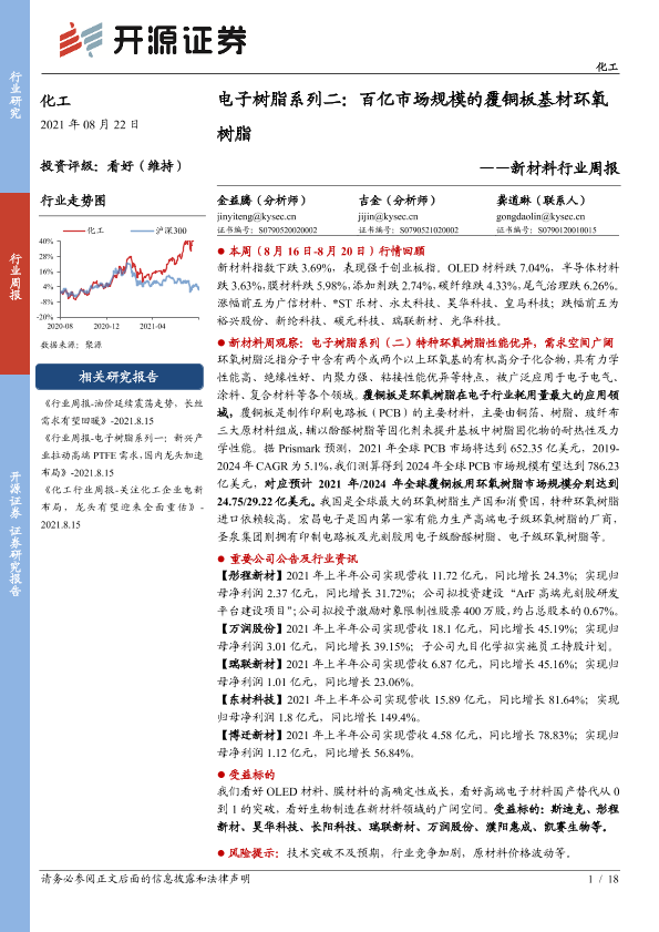 【开源证券】【20210822】电子树脂系列二:百亿市场规模的覆铜板基材环氧树脂-18页