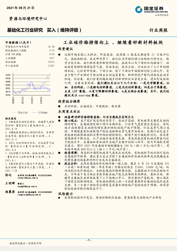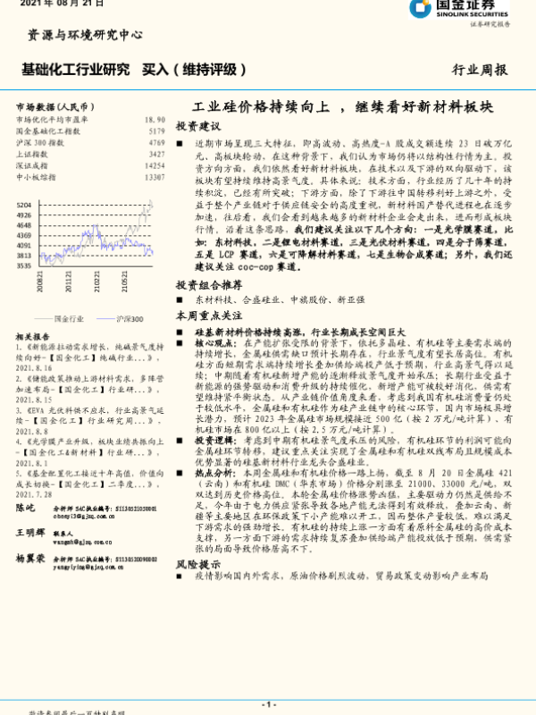 【国金证券】【20210821】基础化工行业研究:工业硅价格持续向上,继续看好新材料板块-30页