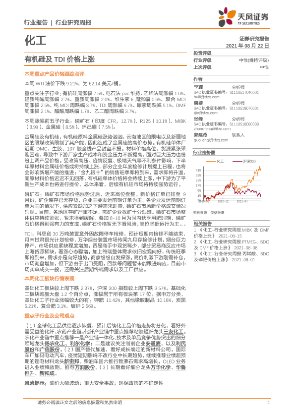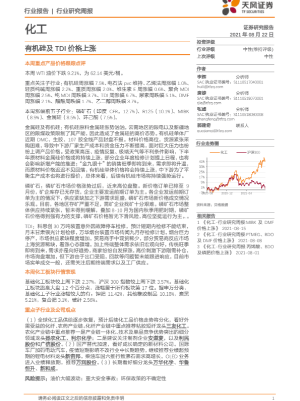 【天风证券】【20210822】20210822-天风证券-化工行业研究周报:有机硅及TDI价格上涨-21页