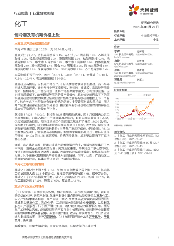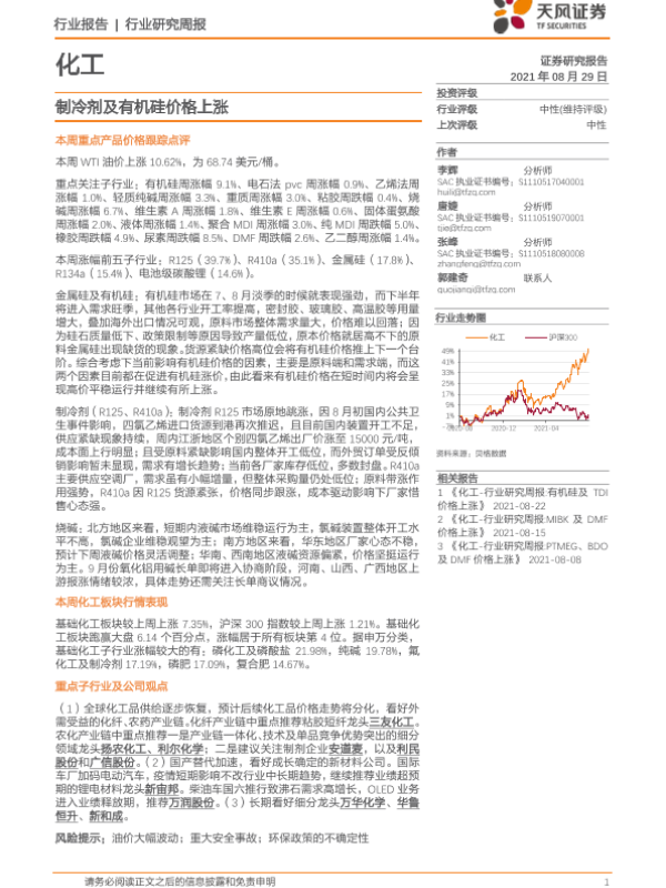 【天风证券】【20210829】20210829-天风证券-化工行业研究周报:制冷剂及有机硅价格上涨-21页