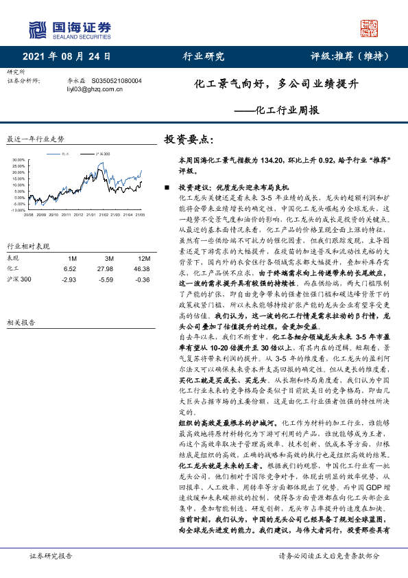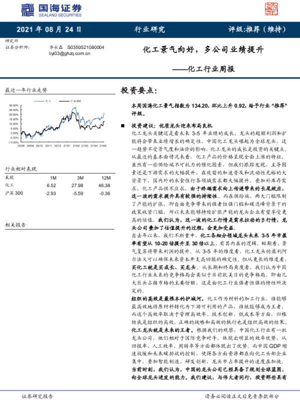 【国海证券】【20210824】化工行业周报:化工景气向好,多公司业绩提升-49页