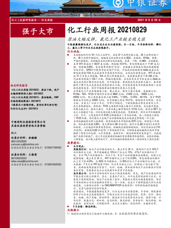 【中银证券】【20210829】化工行业周报:原油大幅反弹,氟化工产业链全线大涨-11页