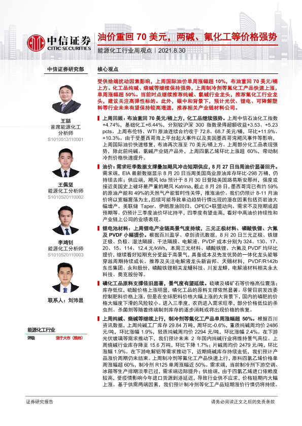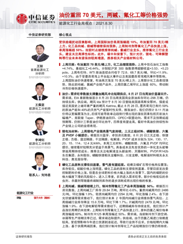 【中信证券】【20210830】能源化工行业周观点:油价重回70美元,两碱、氟化工等价格强势-16页