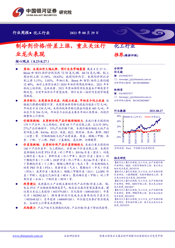 【银河证券】【20210829】20210829-中国银河-化工行业周报:制冷剂价格 价差上涨,重点关注行业龙头表现-18页