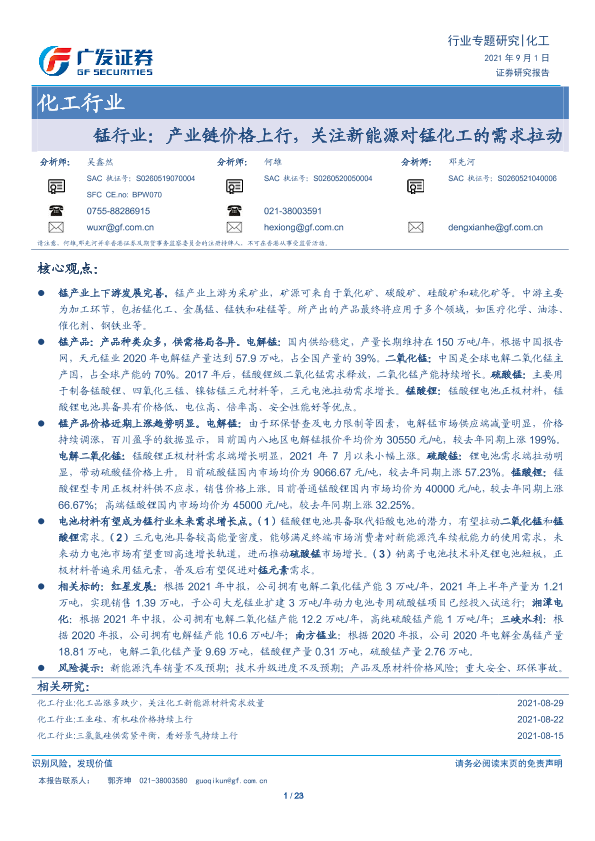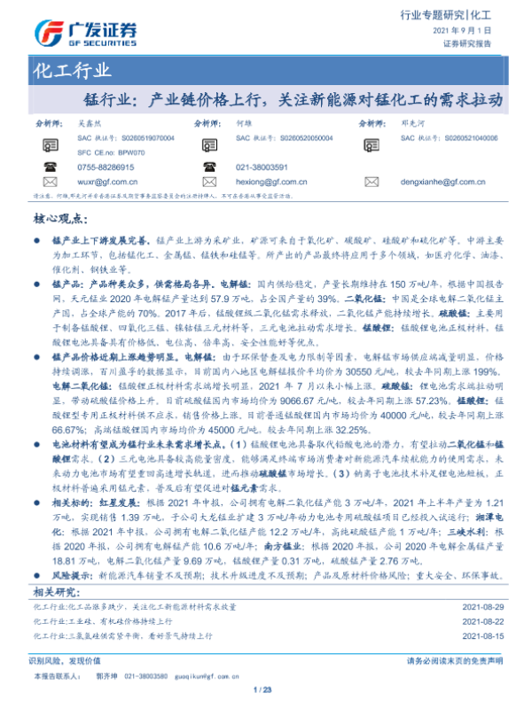 【广发证券】【20210901】锰行业:产业链价格上行,关注新能源对锰化工的需求拉动-23页