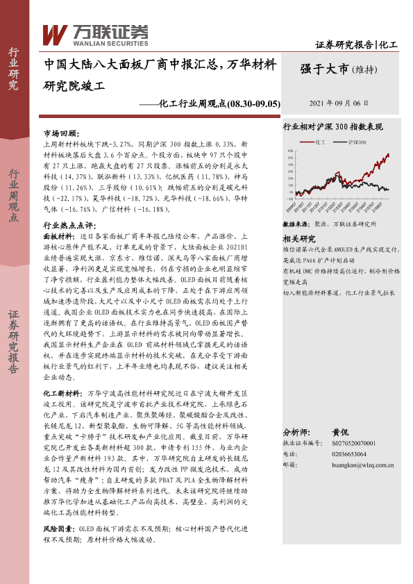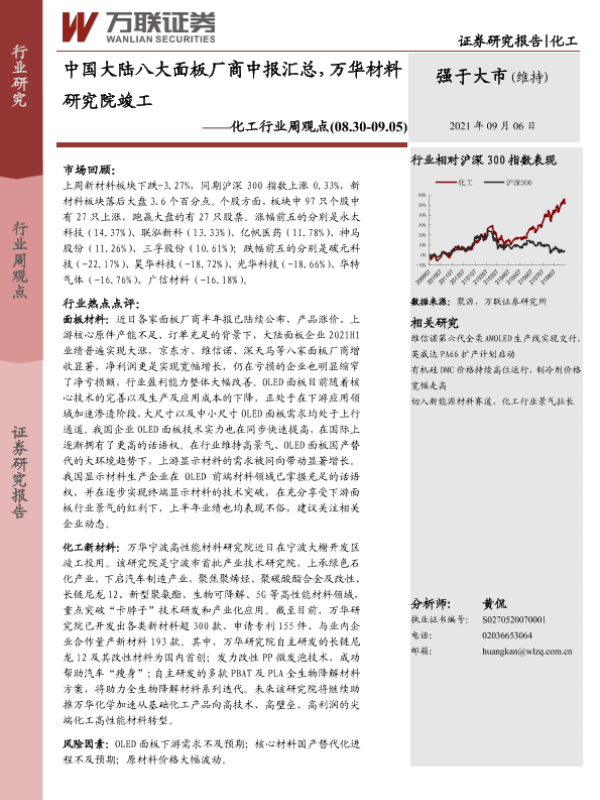 【万联证券】【20210906】20210906-万联证券-化工行业周观点:中国大陆八大面板厂商中报汇总,万华材料研究院竣工-11页
