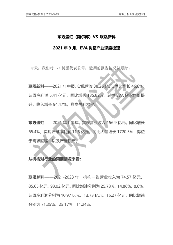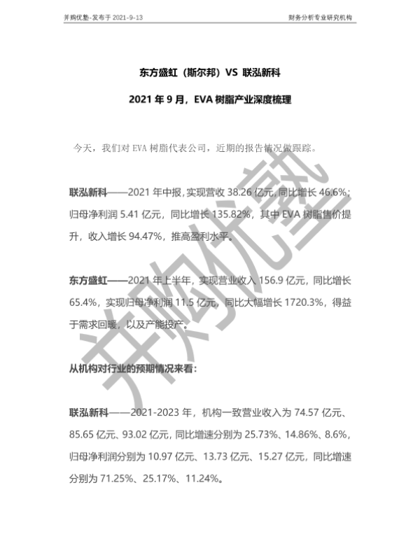 【并购优塾】【20210913】2021年9月,EVA树脂产业深度梳理:东方盛虹(斯尔邦)VS联泓新科-19页
