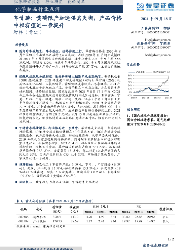 【东吴证券】【20210918】化学制品行业点评:草甘膦:黄磷限产加速供需失衡,产品价格中枢有望进一步提升-2页