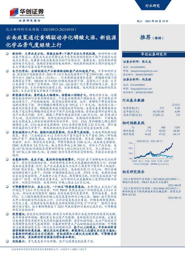 【华创证券】【20210919】20210919-华创证券-化工新材料行业周报:云南政策通过黄磷驱动净化磷酸大涨,新能源化学品景气度继续上行-38页