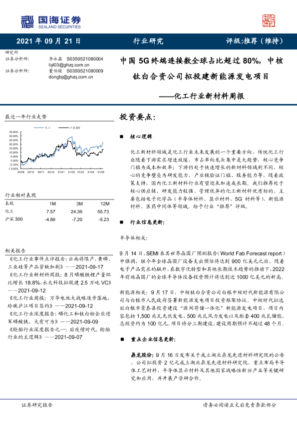 【国海证券】【20210921】化工行业新材料周报:中国5G终端连接数全球占比超过80%,中核钛白合资公司拟投建新能源发电项目-28页