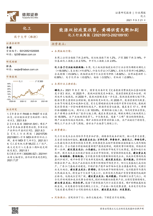 【德邦证券】【20210921】20210921-德邦证券-化工行业周报:能源双控政策收紧,黄磷供需失衡加剧-22页