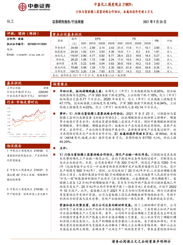 【中泰证券】【20210925】中泰化工周度观点21W39:川恒与富临精工签署战略合作协议,金属硅报价突破6万元-25页