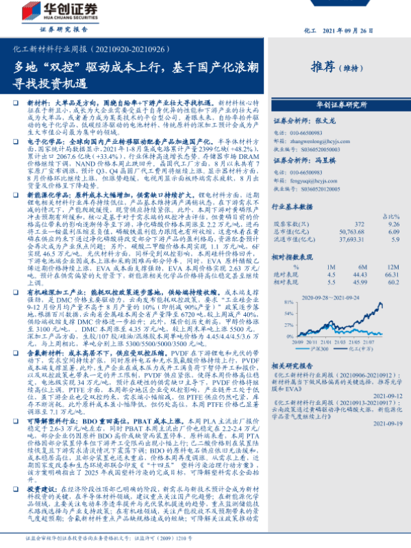 【华创证券】【20210926】20210926-华创证券-化工新材料行业周报:多地“双控”驱动成本上行,基于国产化浪潮寻找投资机遇-34页