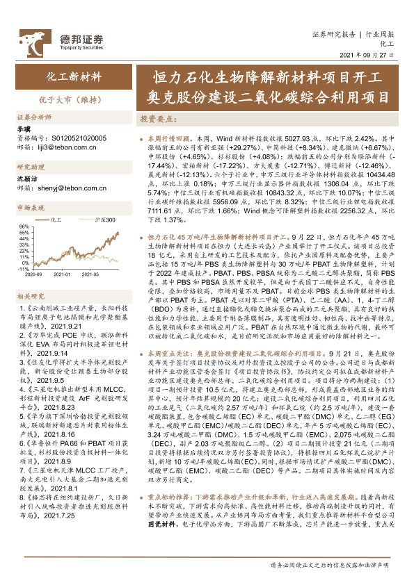 【德邦证券】【20210927】20210927-德邦证券-化工新材料行业周报:恒力石化生物降解新材料项目开工,奥克股份建设二氧化碳综合利用项目-15页