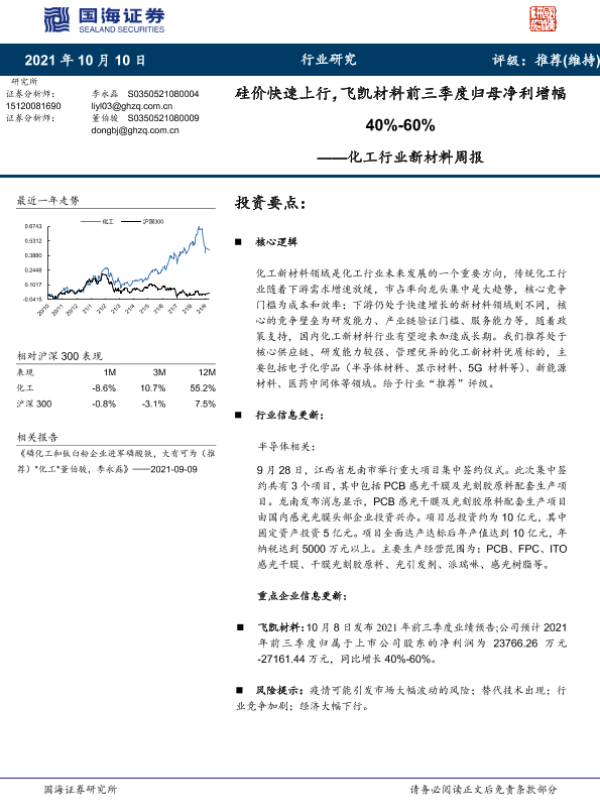 【国海证券】【20211010】20211010-国海证券-化工行业新材料周报:硅价快速上行,飞凯材料前三季度归母净利增幅40%-60%-31页