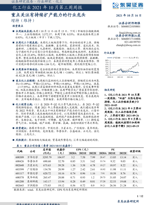 【东吴证券】【20211016】化工行业2021年10月第三周周报:重点关注有持续扩产能力的行业龙头-12页