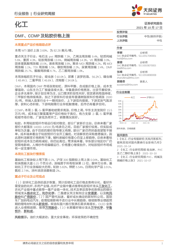 【天风证券】【20211017】20211017-天风证券-化工行业研究周报:DMF、CCMP及粘胶价格上涨-21页