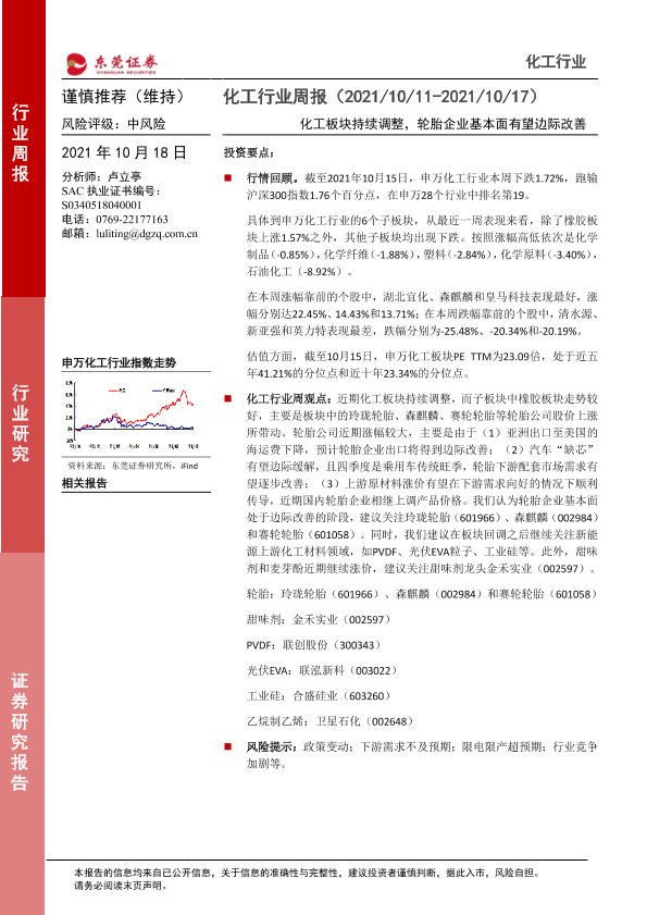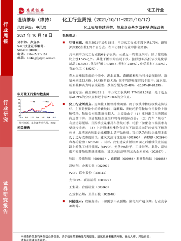 【东莞证券】【20211018】20211018-东莞证券-化工行业周报:化工板块持续调整,轮胎企业基本面有望边际改善-11页