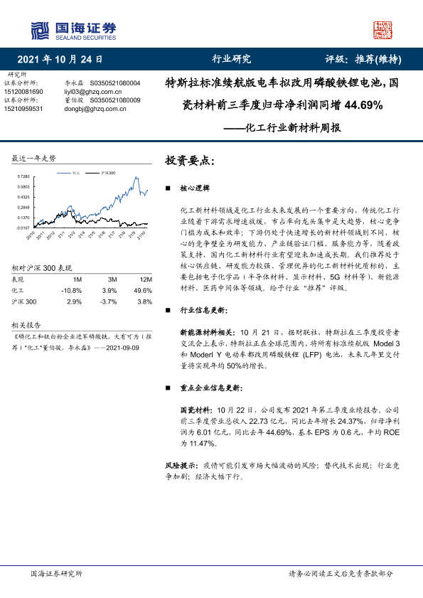 【国海证券】【20211024】20211024-国海证券-化工行业新材料周报:特斯拉标准续航版电车拟改用磷酸铁锂电池,国瓷材料前三季度归母净利润同增44.69%-30页