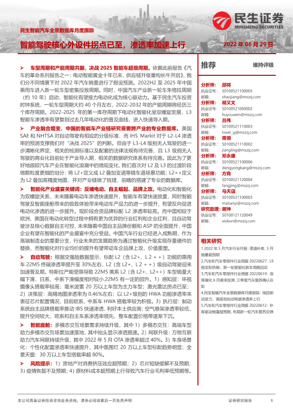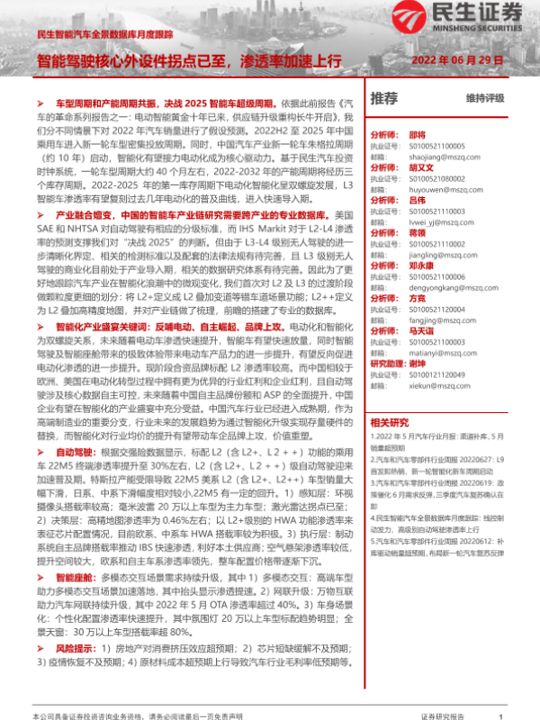 【民生证券】【20220629】智能汽车行业全景数据库月度跟踪:智能驾驶核心外设件拐点已至,渗透率加速上行-17页