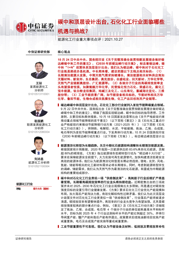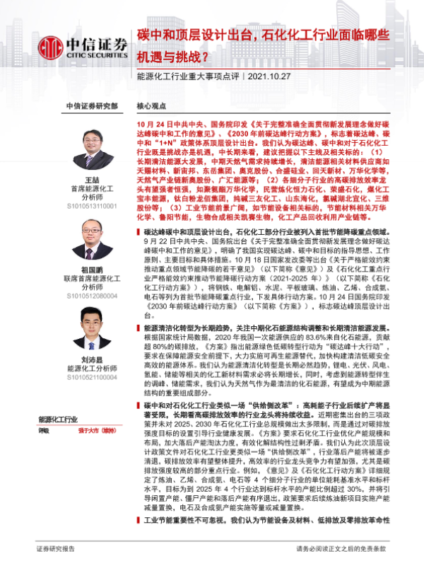 【中信证券】【20211027】能源化工行业重大事项点评:碳中和顶层设计出台,石化化工行业面临哪些机遇与挑战?-4页