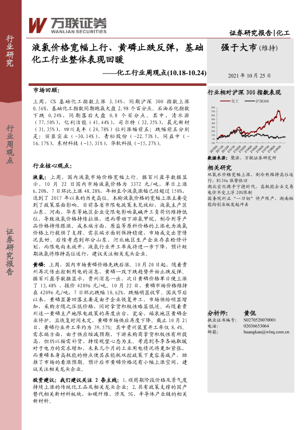 【万联证券】【20211025】20211025-万联证券-化工行业周观点:液氯价格宽幅上行、黄磷止跌反弹,基础化工行业整体表现回暖-12页