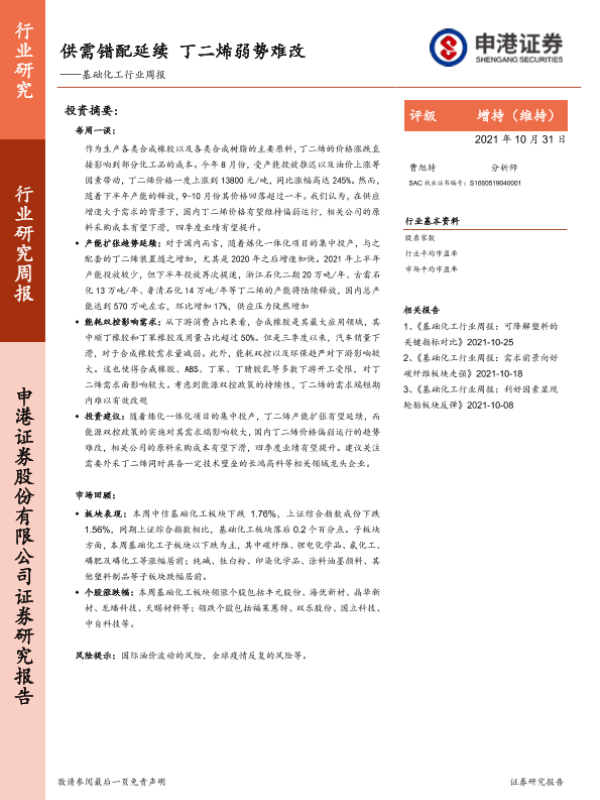 【申港证券】【20211031】基础化工行业周报:供需错配延续 丁二烯弱势难改-11页