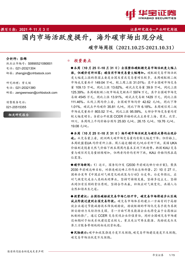 【华宝证券】【20211103】20211103-华宝证券-碳市场周报:国内市场活跃度提升,海外碳市场出现分歧-15页