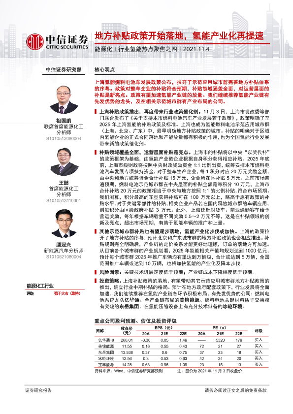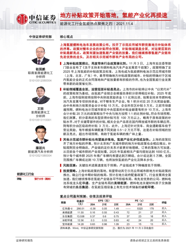 【中信证券】【20211104】能源化工行业氢能热点聚焦之四:地方补贴政策开始落地,氢能产业化再提速-2页