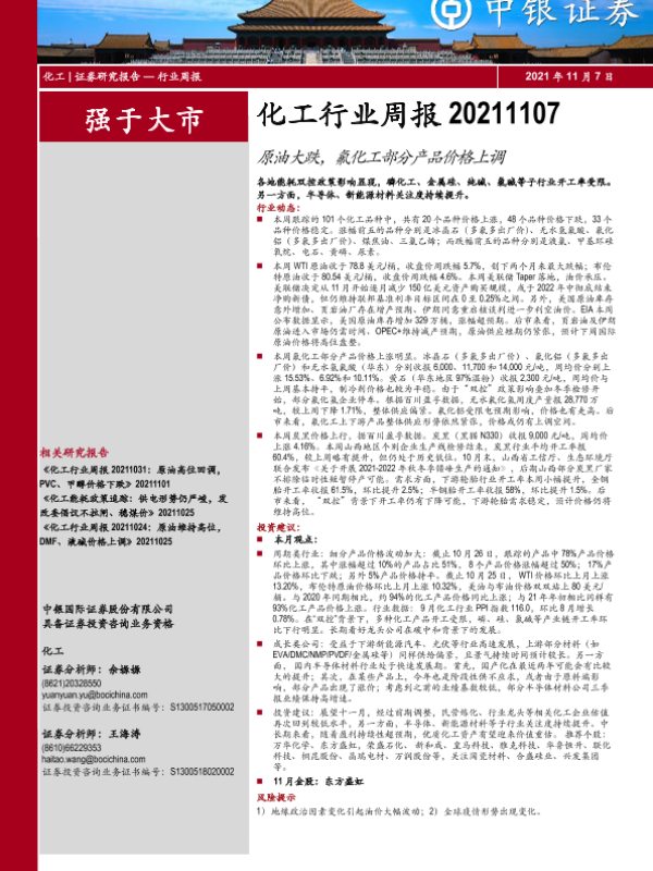 【中银证券】【20211107】20211107-中银证券-化工行业周报:原油大跌,氟化工部分产品价格上调-12页