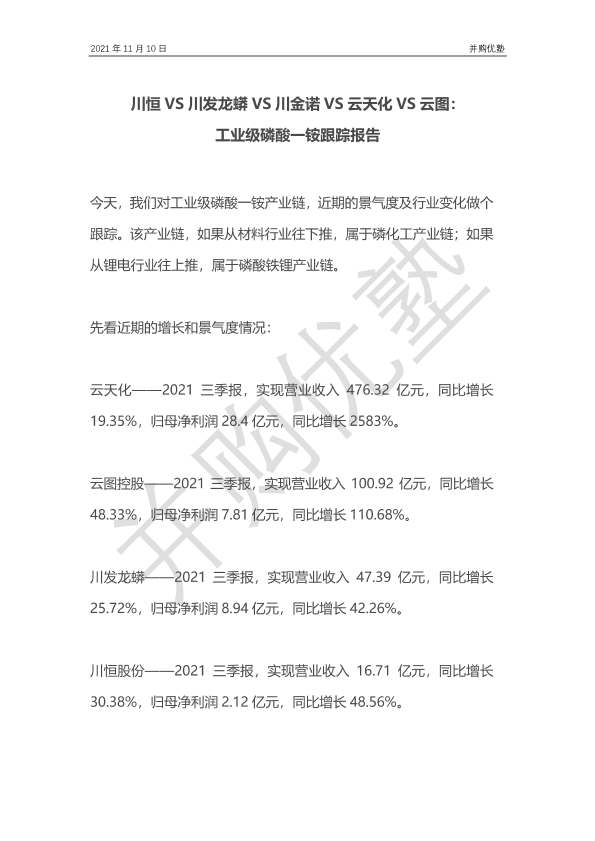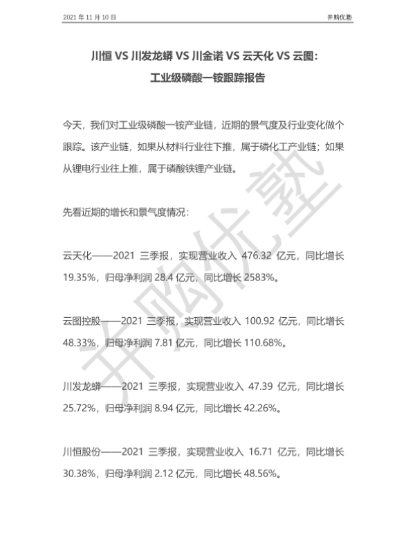 【并购优塾】【20211110】川恒VS川发龙蟒VS川金诺VS云天化VS云图:工业级磷酸一铵跟踪报告-27页