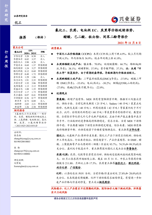 【兴业证券】【20211108】20211108-兴业证券-化工行业周报:氟化工、农药、电池级EC、炭黑等价格延续涨势,醋酸、己二酸、钛白粉、间苯二酚等涨价-44页
