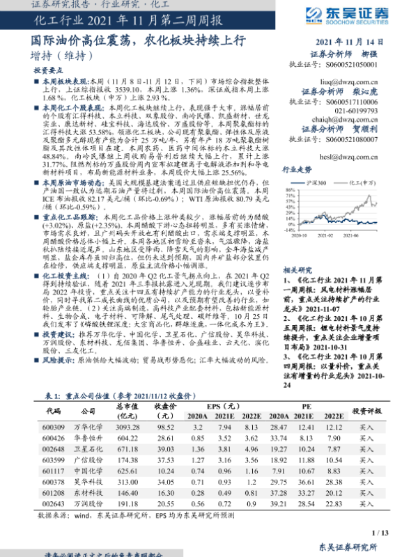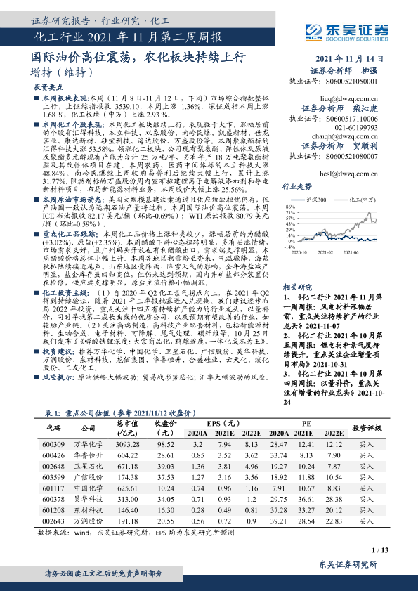 【东吴证券】【20211114】化工行业2021年11月第二周周报:国际油价高位震荡,农化板块持续上行-13页