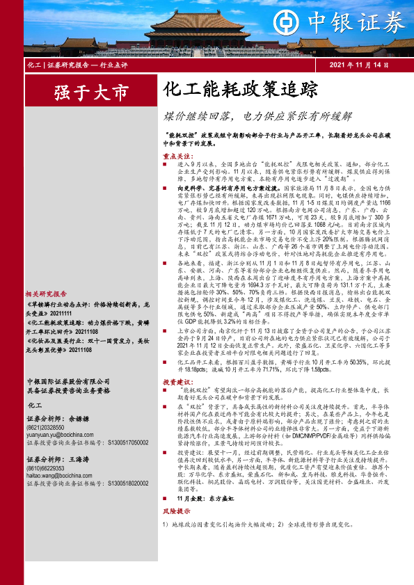 【中银证券】【20211114】化工能耗政策追踪:煤价继续回落,电力供应紧张有所缓解-14页