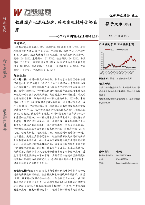 【万联证券】【20211115】化工行业周观点:锂膜国产化进程加速,碳硅负极材料优势显著-11页