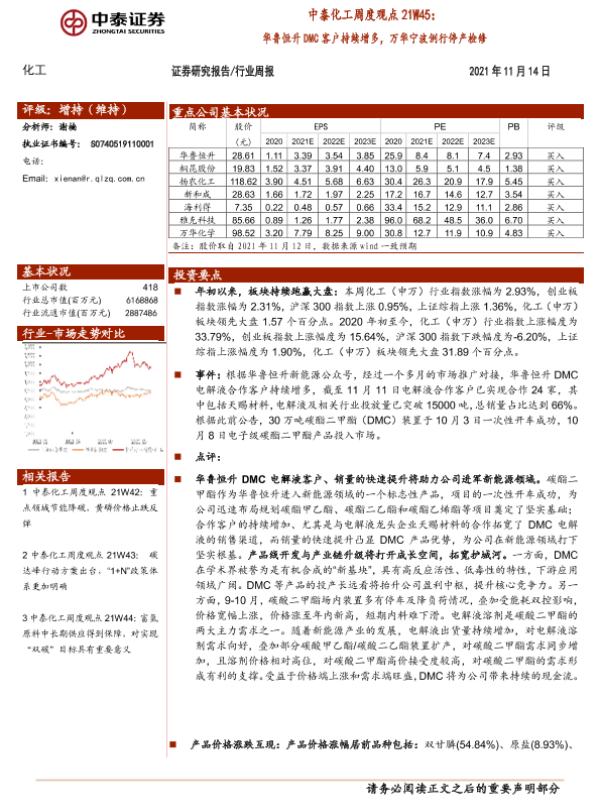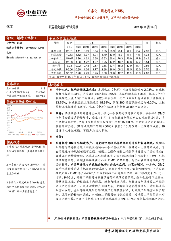 【中泰证券】【20211114】中泰化工周度观点21W45:华鲁恒升DMC客户持续增多,万华宁波例行停产检修-25页