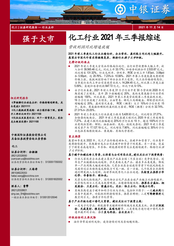 【中银证券】【20211114】化工行业2021年三季报综述:营收利润同比增速放缓-20页