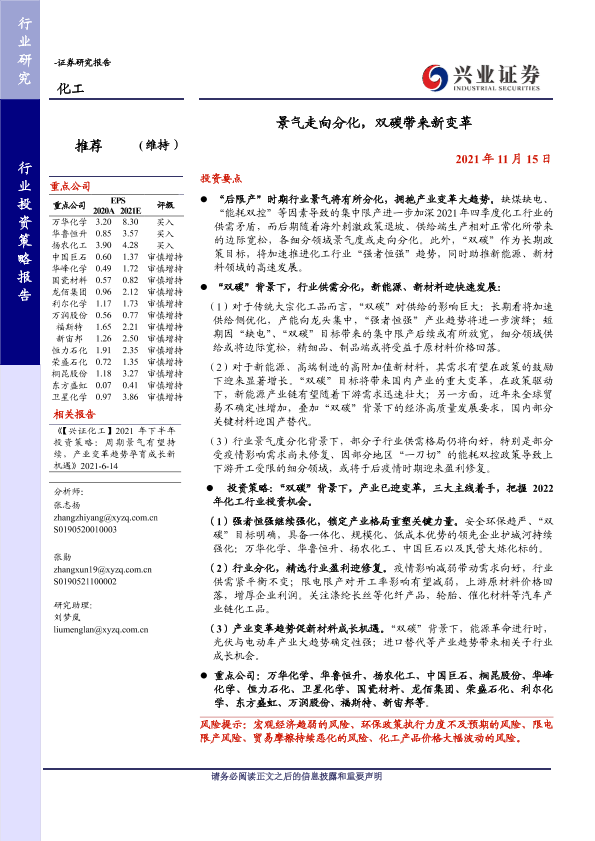 【兴业证券】【20211115】20211115-兴业证券-化工行业投资策略报告:景气走向分化,双碳带来新变革-66页
