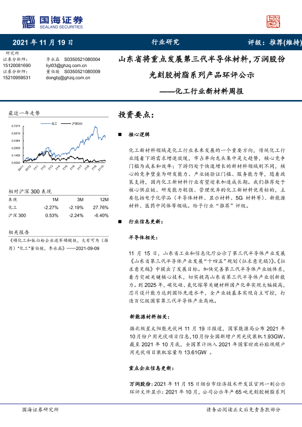 【国海证券】【20211119】20211119-国海证券-化工行业新材料周报:山东省将重点发展第三代半导体材料,万润股份光刻胶树脂系列产品环评公示-34页