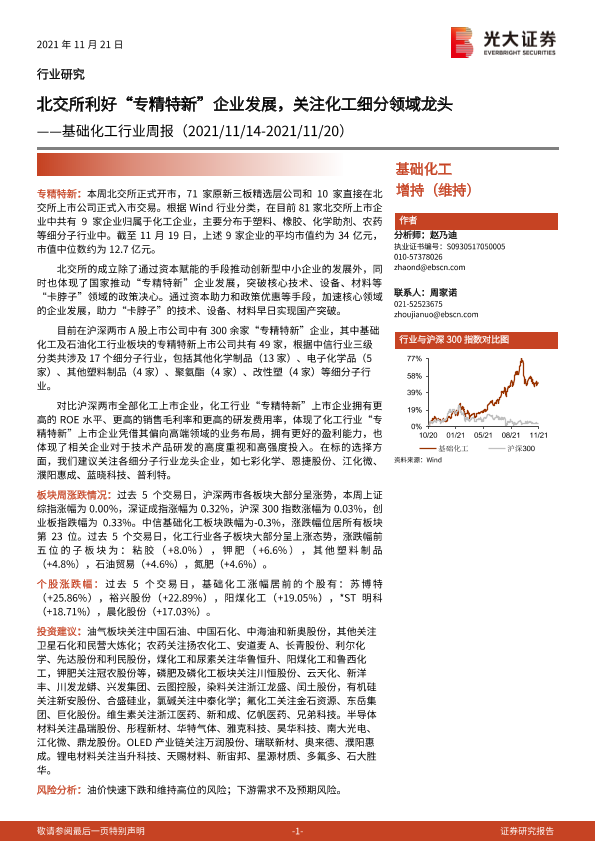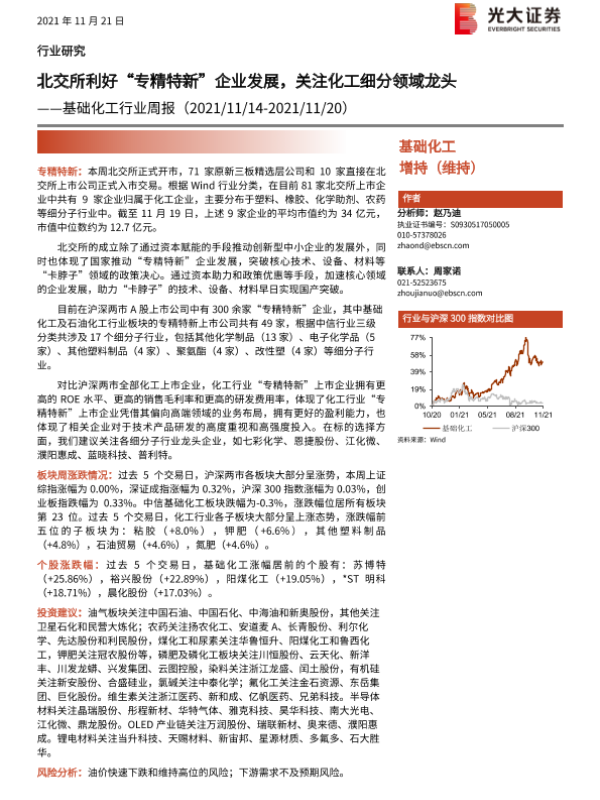【光大证券】【20211121】基础化工行业周报:北交所利好“专精特新”企业发展,关注化工细分领域龙头-24页