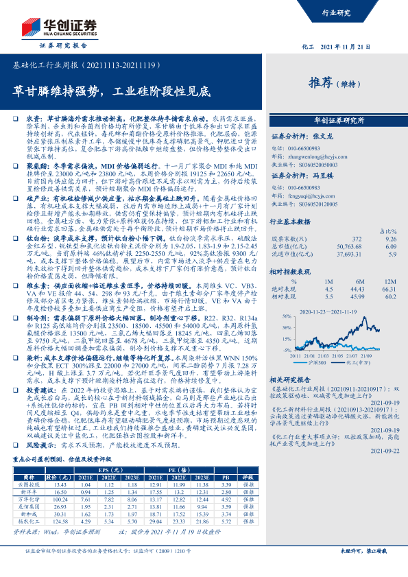 【华创证券】【20211121】基础化工行业周报:草甘膦维持强势,工业硅阶段性见底-22页