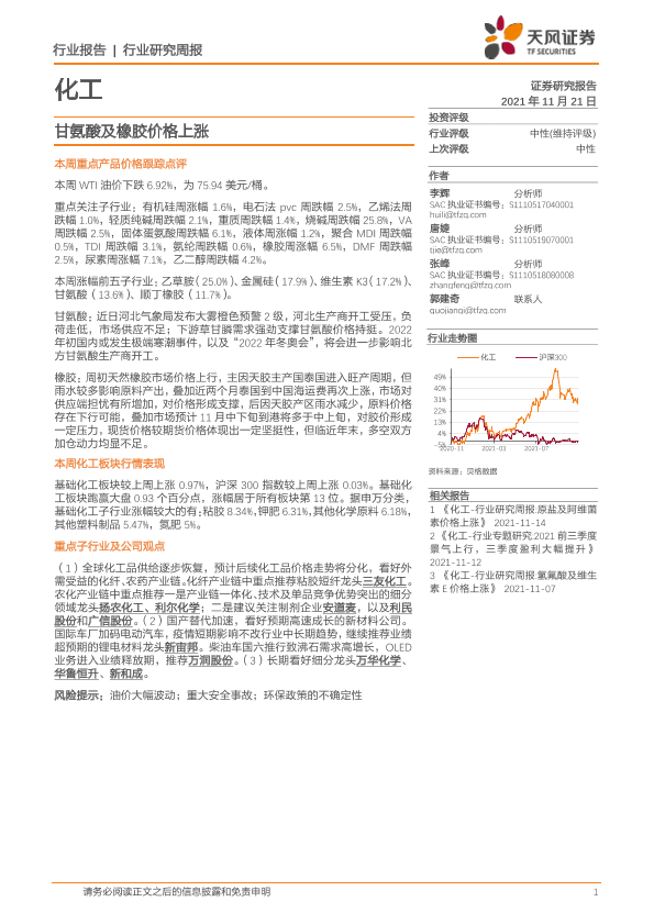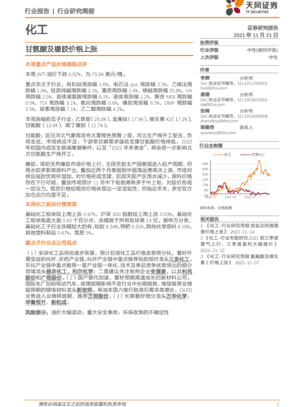 【天风证券】【20211121】20211121-天风证券-化工行业研究周报:甘氨酸及橡胶价格上涨-21页