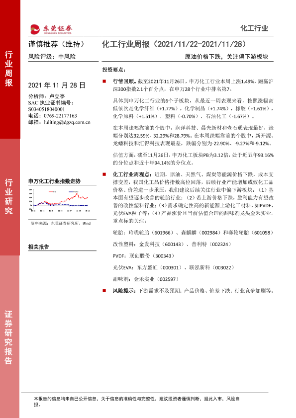 【东莞证券】【20211128】20211128-东莞证券-化工行业周报:原油价格下跌,关注偏下游板块-10页