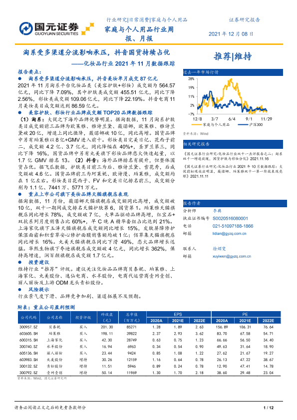 【国元证券】【20211208】淘系受多渠道分流影响承压,抖音国货持续占优——化妆品行业2021年11月数据跟踪-12页