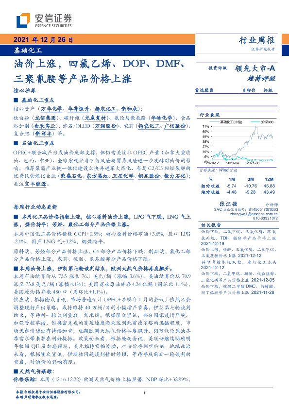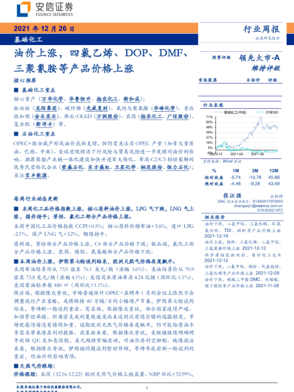 【安信证券】【20211226】基础化工行业周报:油价上涨,四氯乙烯、DOP、DMF、三聚氰胺等产品价格上涨-5页