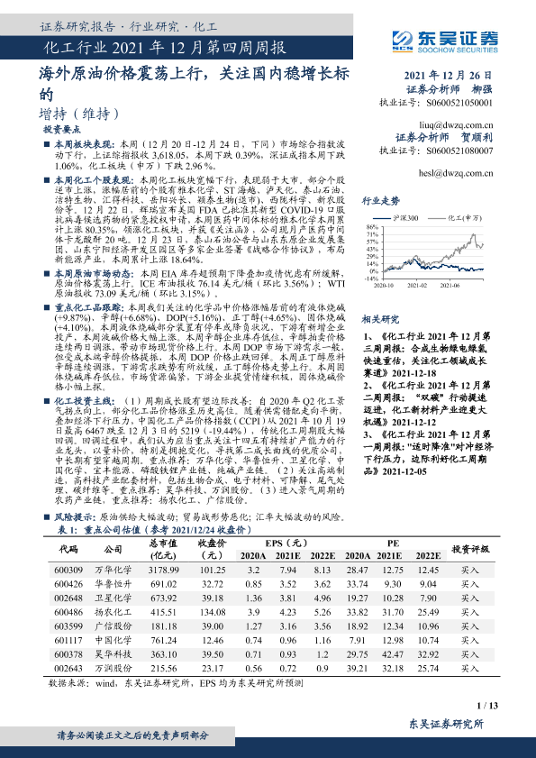 【东吴证券】【20211226】化工行业2021年12月第四周周报:海外原油价格震荡上行,关注国内稳增长标的-13页