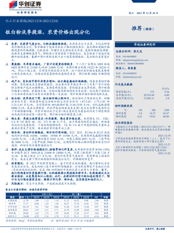 【华创证券】【20211226】20211226-华创证券-化工行业周报:钛白粉淡季提涨,农资价格出现分化-22页